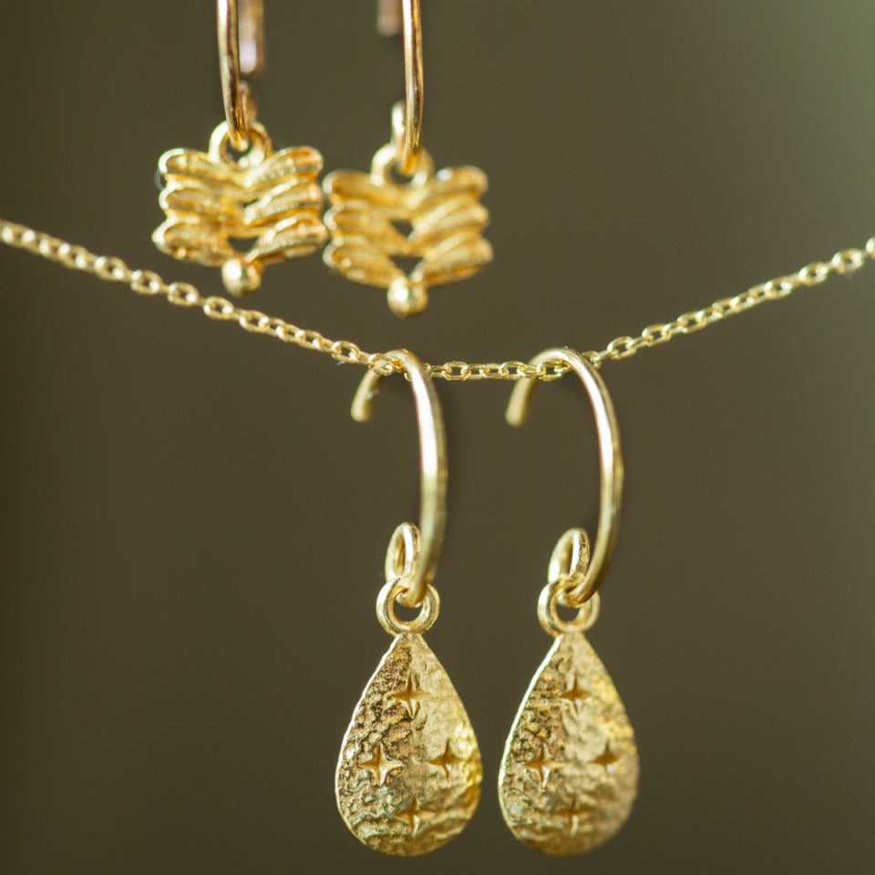 Handgefertigte, vergoldete MUJA JUMA Ohrringe aus echtem Sterlingsilber 925 mit mattierten, tropfenförmigen, leicht gebürsteten Anhängern mit Sternen-Muster.