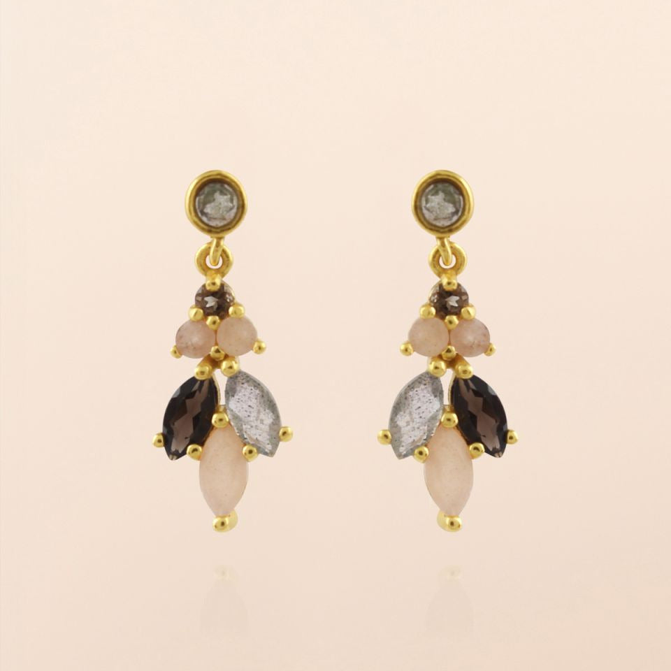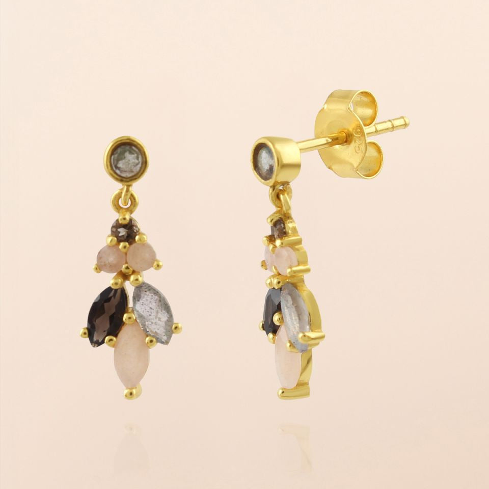 Vergoldete MUJA JUMA Ohrstecker aus Sterlingsilber 925 mit sieben Halbedelsteinen: rundenen Labradoit-, Mond-Steinen, Rauchquarz-Steinen.